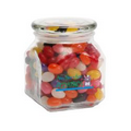 12 Oz. glass jar with glass top. Filled with chocolate covered espresso beans. 4 3/8" H x 3 1/2" D