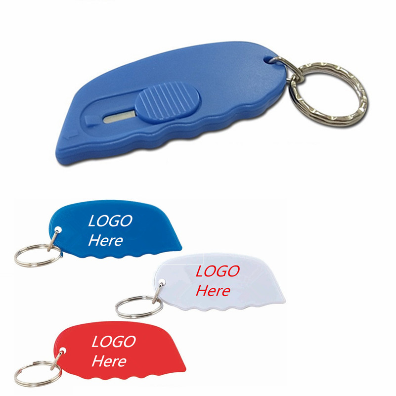 Retractable utility cutter/knife with slide action side blade extender and grooved side finger grip on a round split key ring. 2 3/4" L x 1 1/4" W