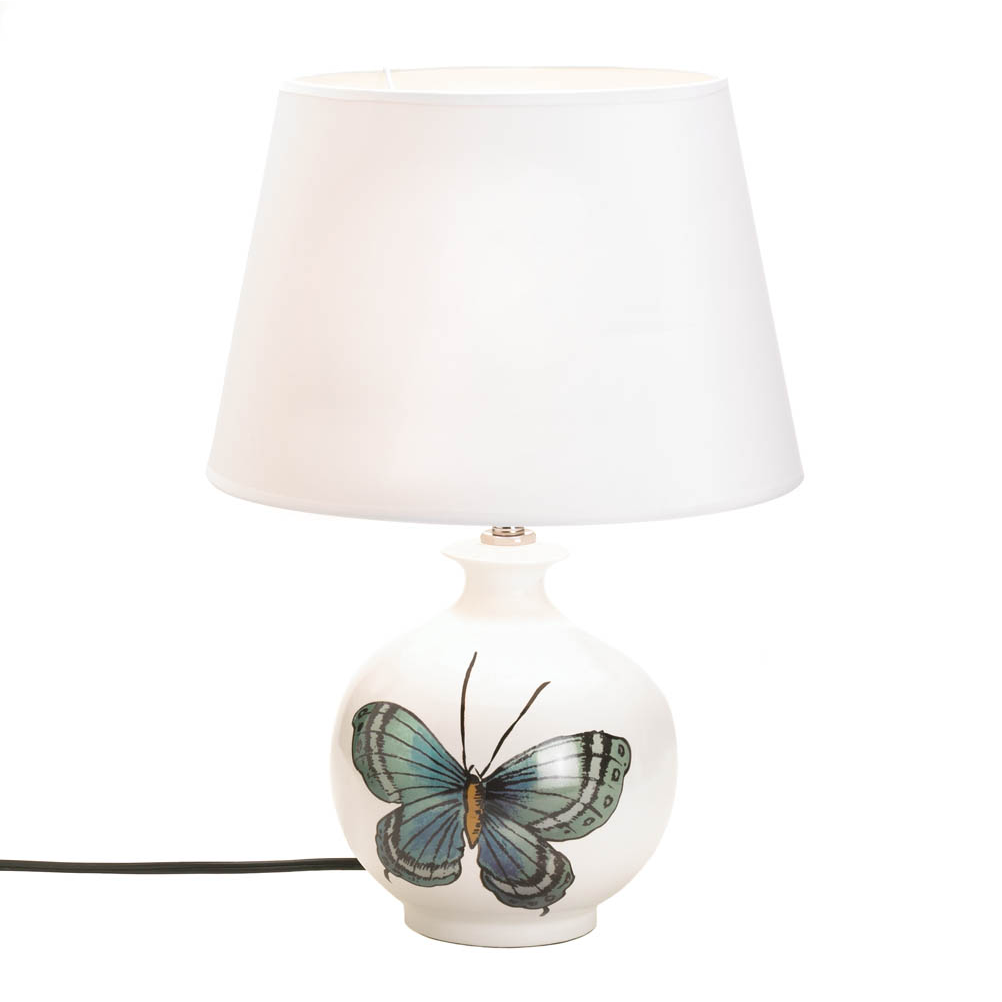 A beautifully drawn and artistically colored butterfly adorns this curvaceous white ceramic table lamp. The soft white shade defuses the bright light from the bulb within to create a warm, welcoming ambiance. Ceramic base with fabric shade. Round Shade 12 1/2"x8 1/2". 12 1/2" L x 12 1/2" W x 18" H
