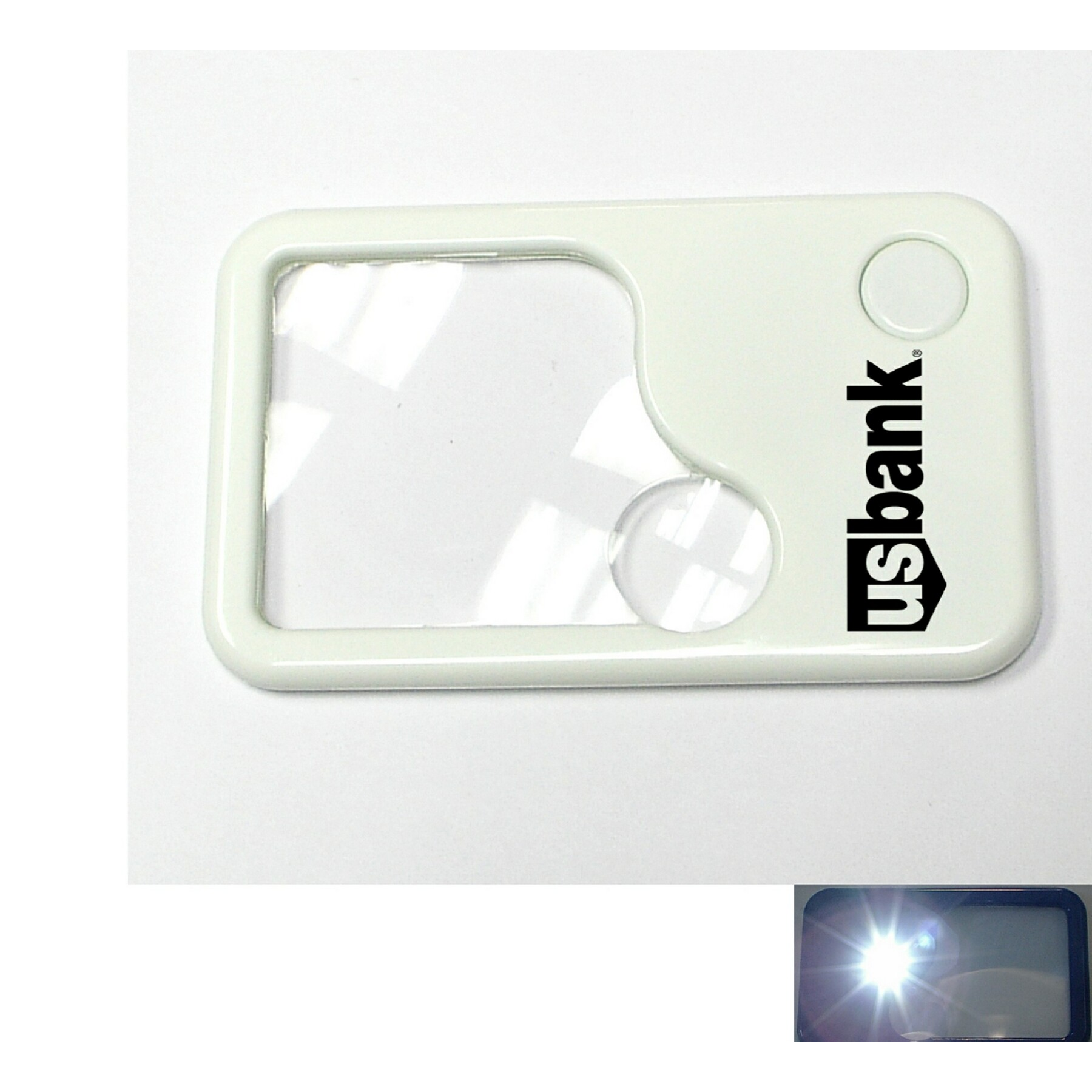 Credit card size magnifier with LED flashlight. Powerful high quality 3X magnification, ultra thin, durable, heavy duty, on/ off switch, perfect for reading small print, newspapers, telephone directories, restaurant menu, maps, charts and so on. Thin, easy to place. Can be used as bookmark, business card, palm light, desktop accessories, giveaway at the trade show and self promo. A great way to promote your business, nursing home, hospital, project and event. 3 7/8" L x 2 3/8" W