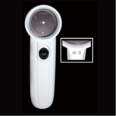 6X Illuminated Handheld Magnifier. Uses 3-AAA Batteries (Not included). Magnification is 6X. Clear glass lens. 1.5" Diameter