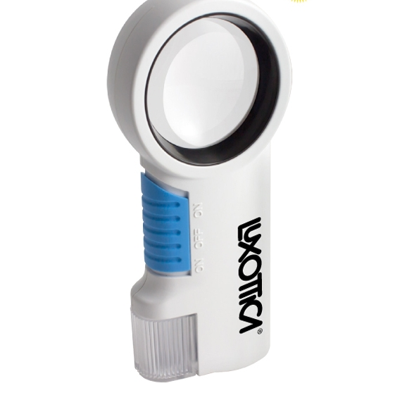 Handheld, Free Standing, Handle, Round, Circle, Compact, Tilted Lens, Light Up, Text Enlarger. 5 3/8" W x 2 1/2" Diameter x 1" L