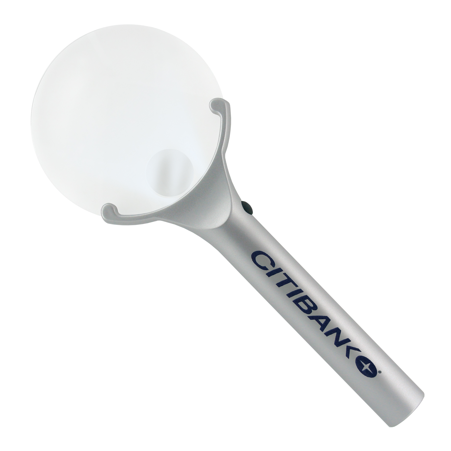 Magnifying Glass - Stylish Rimless Bifocal Magnifier. Magnifier Comes with 2 high-power, long-lasting LED light and Bifocal 5 power inset lens. Large lens is 3 1/2" in diameter and is 2.5 Power. Handle is 5" long with rubber on/off button. Cleaning Cloth included. Uses 2 AAA batteries (Not Included). 3.5" Diameter x 9" L