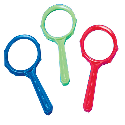 Explore the outdoors with this small magnifying glass. Great party toy for any explorer themed birthday party. Assorted colors. Made of plastic. Size 4 1/2" L. </p> Get a clearer view with a seeing eye toy. Perfect party favor toys for any party. With a wide selection of different viewing toys you'll be sure and find. Complies with CPSIA.