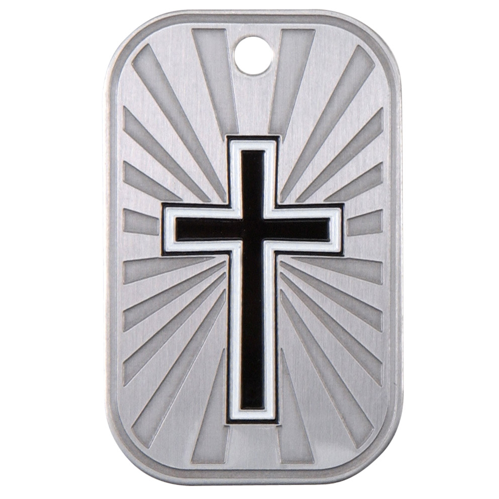 2" - Stainless Steel Dog Tags - "Cross". Comes with a 30" chain attached. There is an additional cost for Laser Engraved Inserts (both sides) or for a Full Color Printed Vinyl Insert (Minimum 10).