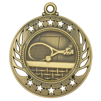 This Tennis Galaxy Medal has a raised image surface with cutout stars and leaves around the border. For Neck Ribbons, See Pages 1200-1206. For a Presentation Box, use item #A005R, #A00B or #WMB60 on Page 600.There is an additional charge for a full color printed vinyl insert (minimum 10), or Laser Engraved Flexibrass insert. 2 1/4" Diameter