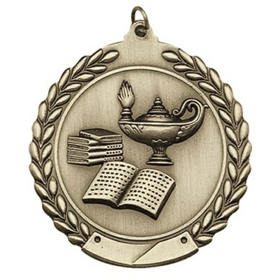 This Lamp-of-Knowledge Medal is 1 3/4" dia., Die Cast and comes in Gold, Silver and Bronze. For Neck Ribbons, see Pages 1200-1206. For Presentation Boxes, see Page 600 - 601. Use item #RP80109BU, #RP80109RD or #WMB50. There is an additional charge for a Laser Engraved Flexibrass Insert or a Full Color Printed Vinyl Insert (minimum 10). 1 3/4" Diameter