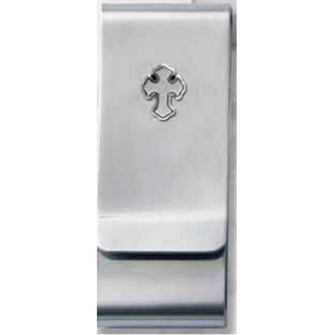 Rectangular standard money clip with a satin steel finish, featuring a budded cross. 2" L