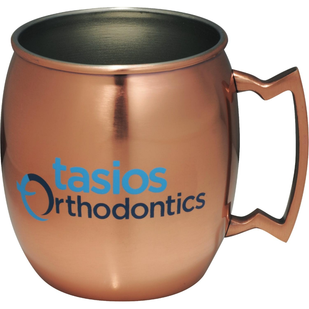 Style inspired by the popular Moscow Mule cocktail. Stainless steel construction with copper coating. Gift box features a robust history of the cocktail and a recipe card is included. 16 Oz. 3.18" H x 3.6" D