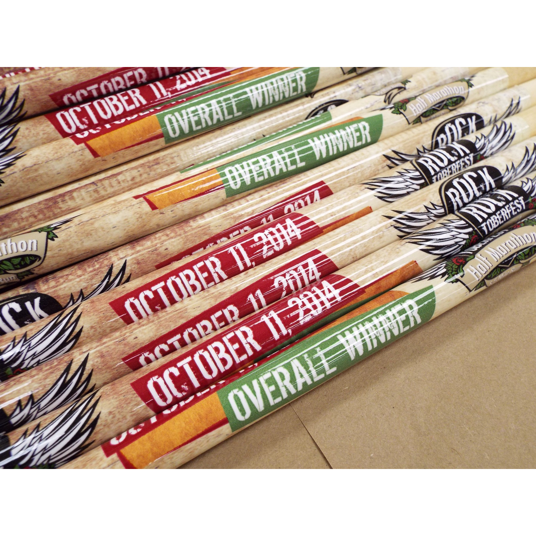 Custom wrapped drum sticks are an easy and inexpensive way to show that your brand rocks! These sticks also work great as a stress reliever. Imagine a pair sitting out on your desk that you can pick up and tap out a beat on any surface at any time. These professional quality drum sticks are manufactured and wrapped in the USA. (Sold in pairs). 16" L x 0.565" Thick
