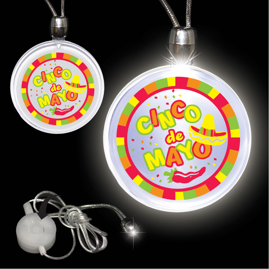 Light up your party and light up four guests for Cinco de Mayo with our Cinco de Mayo light up necklace. Each Cinco de Mayo round pendant is 1 1/4" in diameter and comes on a cord. All pendants have a multi functional switch, slow blink, fast blink or constant on and come with batteries included and installed and white LEDs. Our Cinco de Mayo light up pendant is sold by the piece. Please order in increments of 1 piece. 1 1/4" Diameter x 24" L