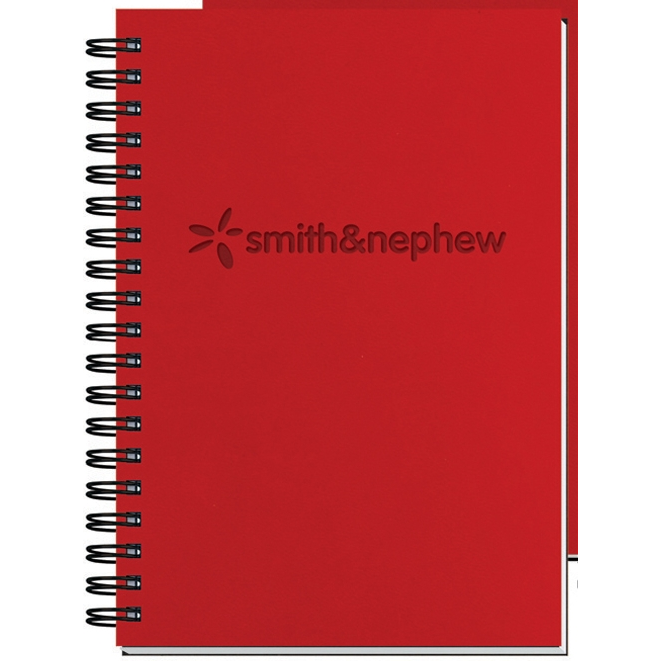 Covers made of supple leather-like material bonded to heavyweight chipboard with blind deboss imprint. 60 Lb. white offset sheets with light gray rules printed on both sides. For 1000+ orders, No extra charge for logo in one standard color on front of each sheet with rules on back, OR 2 colors printed one side with blank back. Wire-O bound on left side in black, pewter, or white. Choice of three free stock inside sheets - graph, ruled or blank. 6.5" W x 8.5" H