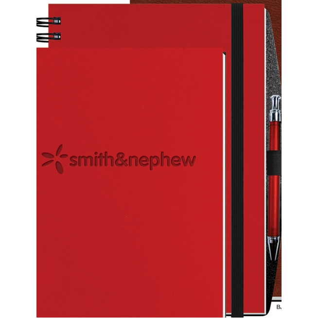 Covers made of supple leather-like material bonded to heavyweight chipboard with blind deboss imprint. 60 Lb. white offset sheets with light gray rules printed on both sides. For 1000+ orders, No extra charge for logo in one standard color on front of each sheet with rules on back, OR 2 colors printed one side with blank back. Wire-O bound on left side in black, pewter, or white. Choice of three free stock inside sheets - graph, ruled or blank. 8 1/2" W x 11" L