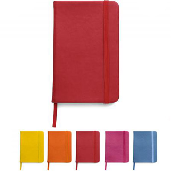 A6 Colorful journal Notebook made of soft PU material, 80 lined pages. Ribbon marker and elastic nylon band for closing. Custom imprint is available. 5 3/4" L x 4" W