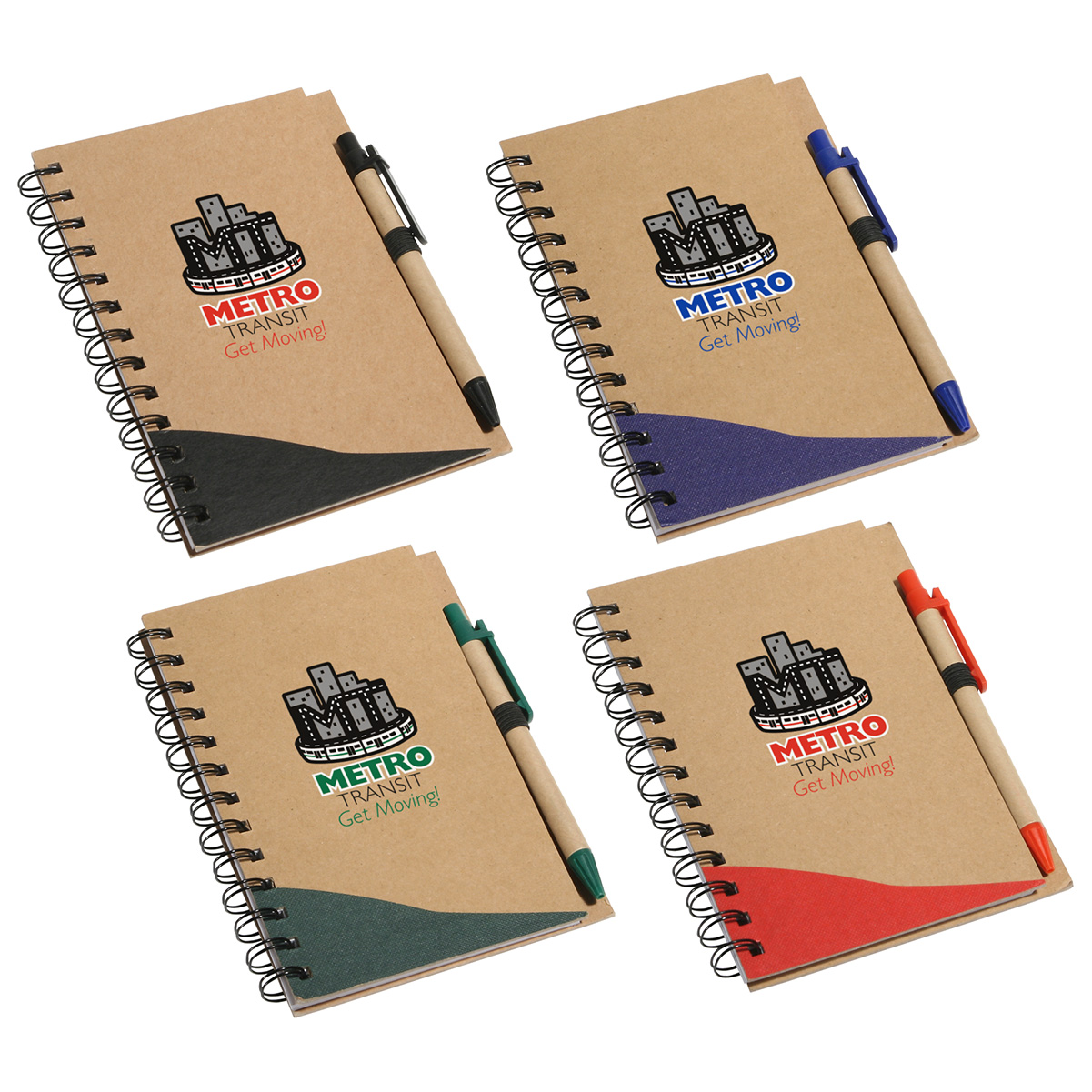 Notebook made from partially recycled materials. Quality spiral binding of 60 lined pages. Ballpoint pen with recycled barrel and elastic pen loop. 5 3/8" W x 6 3/4" H