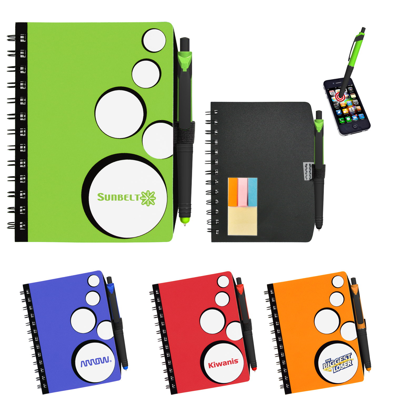 Spiral bound notebook with pen loop. Ball point pen tip retracts and extends through stylus tip. Sticky Notes and paper flags included. Free stylus pen included. Full Color digital imprint available. No rush available for full color digital imprint. 5.75" L x 7" H