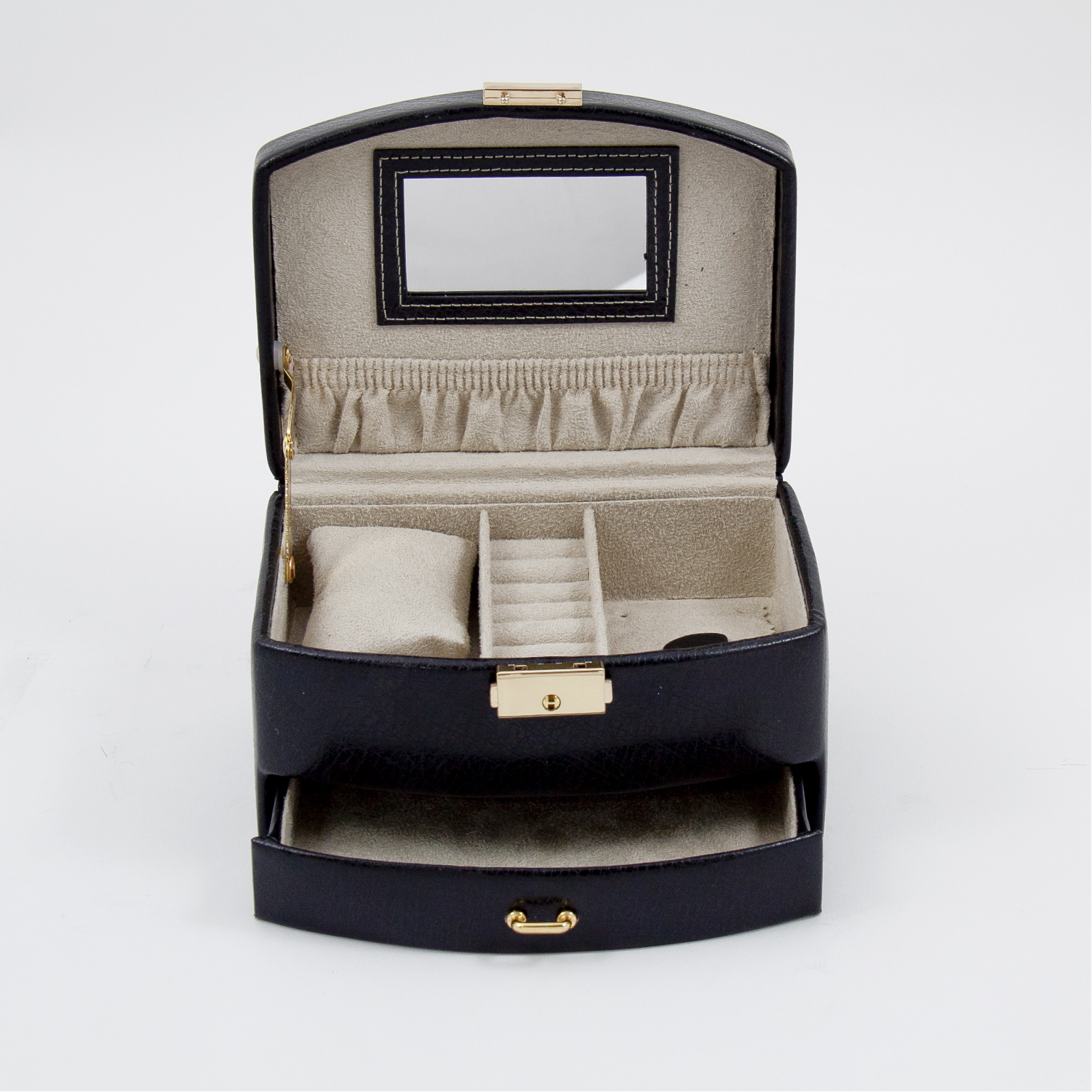 Gift giving just got a lot easier with this beautiful product. Our 2 level jewelry case is made of black leather and is tarnish proof. Customize and personalize this elegant item to create a one of a kind keepsake recipients will cherish for years to come. Birthdays, anniversaries and retirements are just a few of many special occasions to present this product. Take brand recognition to a whole new "level" by ordering this lovely case today!. 7.25" L x 5.25" W x 4" H