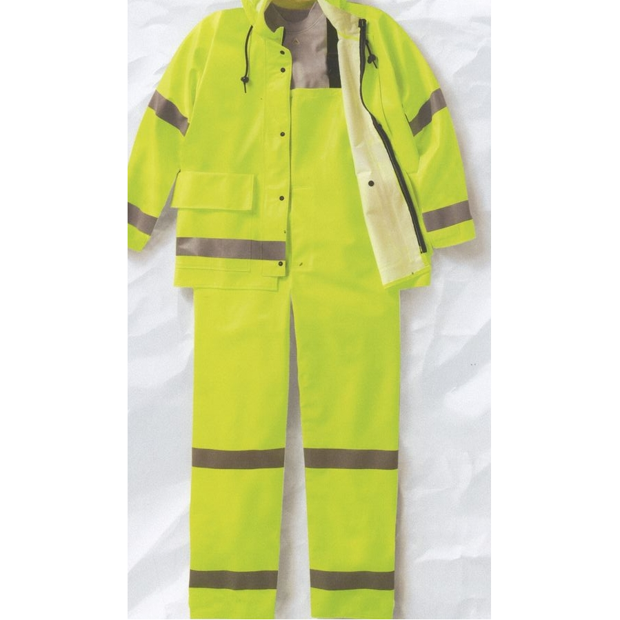 Non-conductive durable hardware. 36049840 visibility with front & back 2" reflective striping. Elasticized shoulder straps with non-conductive adjustable hardware. Take-up ankle tabs. Waterproof. Flame resistant. Made with 13 Oz. PVC/Modacrylic. Available in sizes Small to 6X-Large. Complies with ANSI, ATPV.