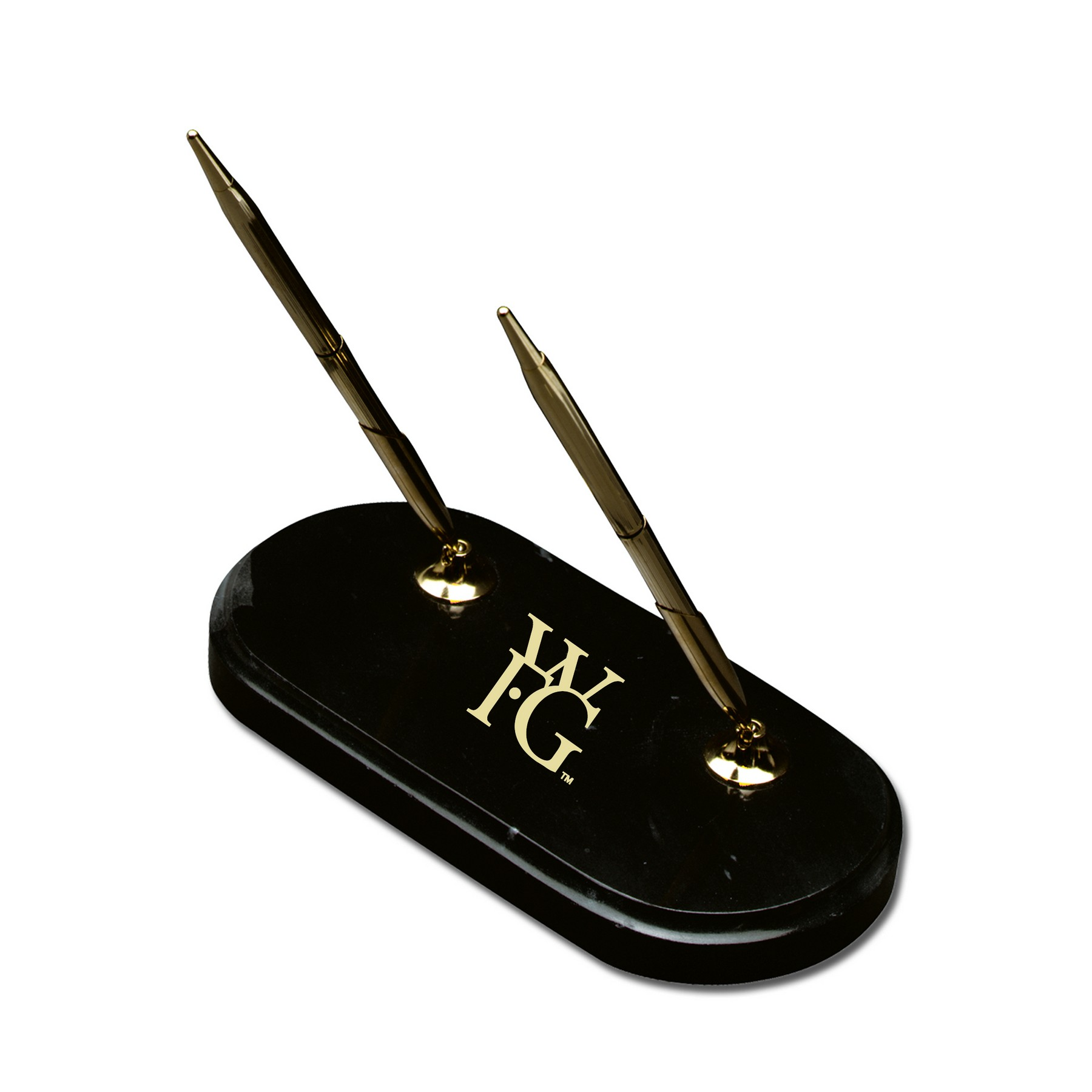 The Oval Pen Stand is jet black and is made of marble. The Oval Pen Stand measures 8"W x 3/4"H x 4"D, weighs 2.5 pounds and is presented in a white gloss gift box. The imprint area is 3"W x 2 "H. 8" W x 3/4" H x 3/4" D