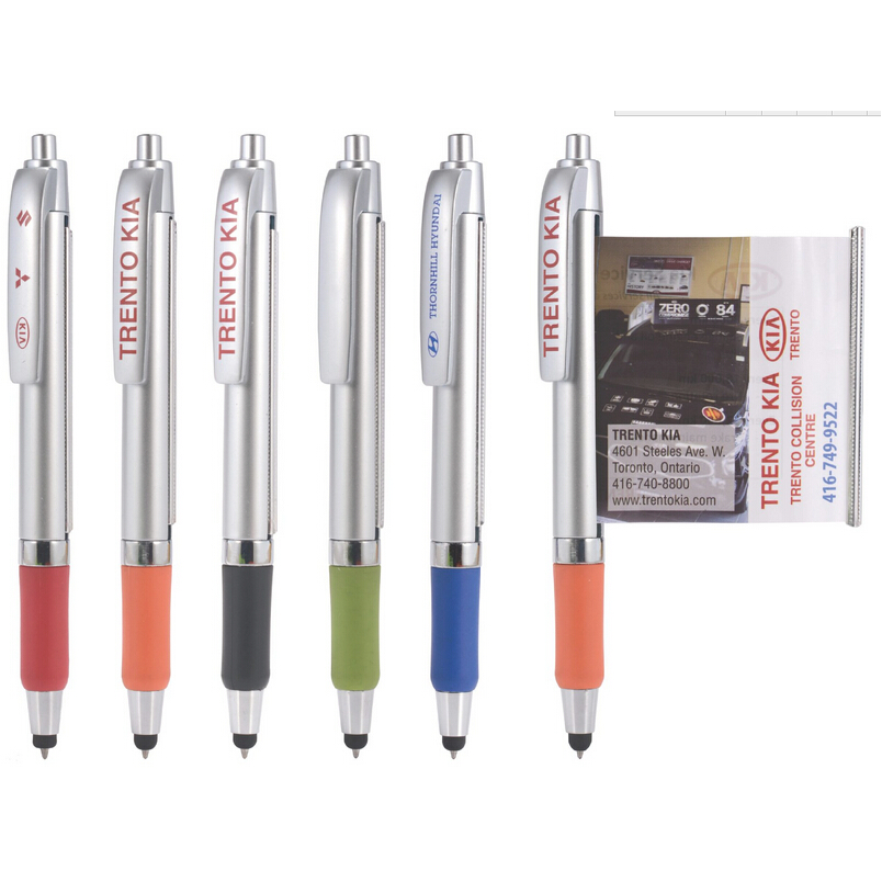 Promotional cheap banner touch pen, the perfect pen for promotion. Includes a retractable pull-out banner inside. With comfortable rubber grip. Good to custom your event slogan and your touch screen. 5.8" H x 0.47" Diameter