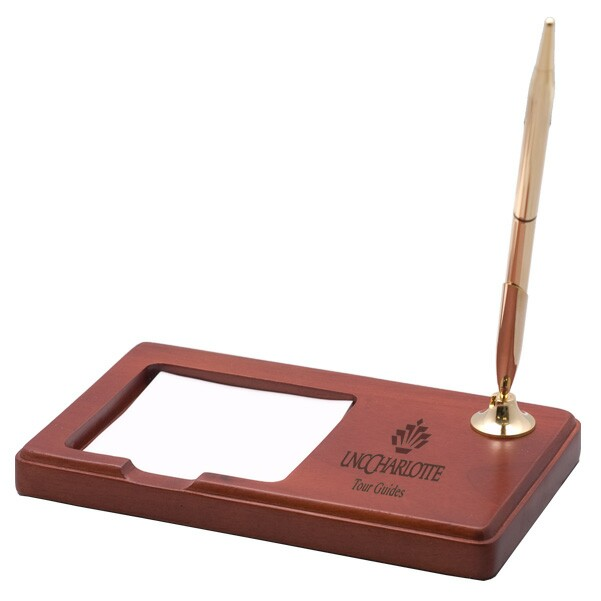 Solid wood desk pen stand in Rosewood finish with gold plated ball point pen, 4 black non-skid feet on the base for extra protection. Note pad is not included. 6.7" L x 4.1" W