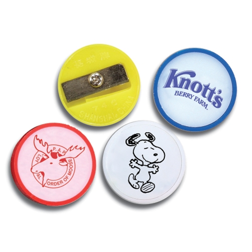 Round pencil sharpener with steel blade. Compliments other products. 1 1/8" Diameter x 1/2" Thick