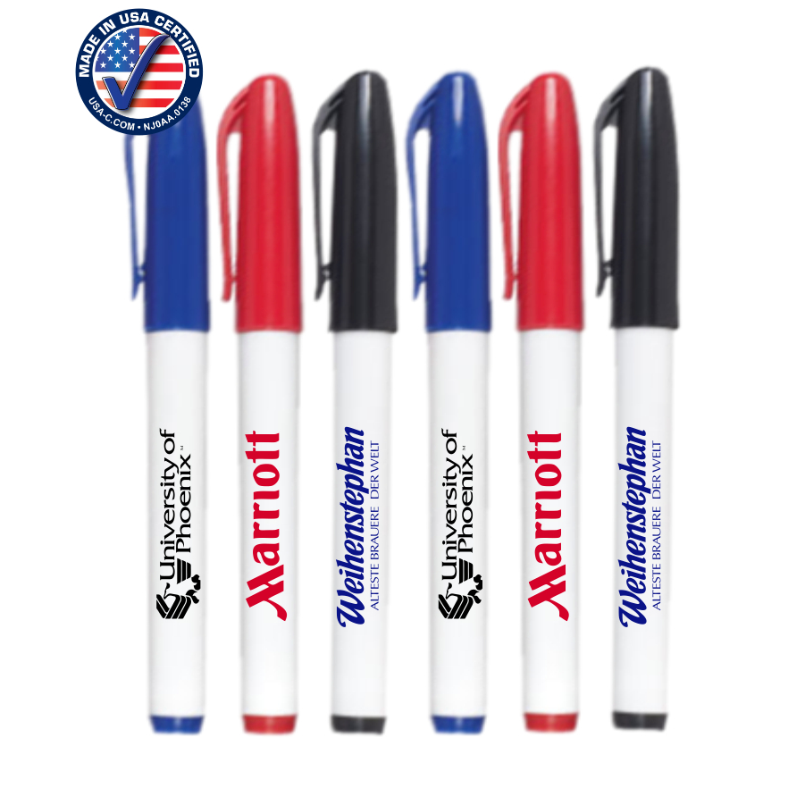 Union Printed, White Barrels Fine-Point permanent markers with Colored Covers. entirely made in the United States with the high quality ink (ink matches the cover color), and decorated in our Union Shop with your Logo and Custom Message - Union Bug Available at No Charge!. 5.5" L x .5" W