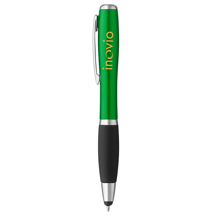 Everyone's favorite Curvaceous Ballpoint Stylus Pen, now with a bright LED flashlight tip! Rich jewel tone color barrel, shiny silver accents, plastic grip, black ink, and soft cushion capacitive tip stylus 5798437664designed to mimic your finger and keep your touchscreen fingerprint free!. 5 1/8" L x 1/2" Diameter