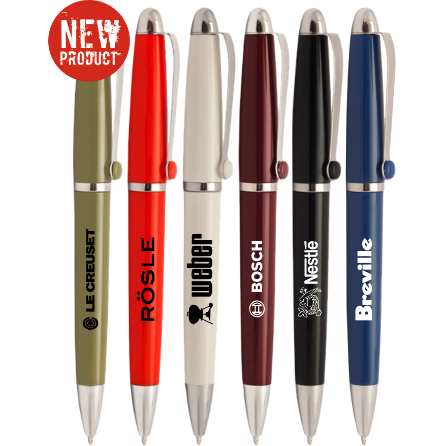 Union Printed, Promotional Uptown Twister Pen, This Smooth Twist Action Ballpoint Pen Features An Elegant Silver Band, pocket Clip and Trim, give the pen flair! Perfect Promo Pen For Hotel Desks, and more. Decorated in our Union Shop - Union Bug Available at No Charge!