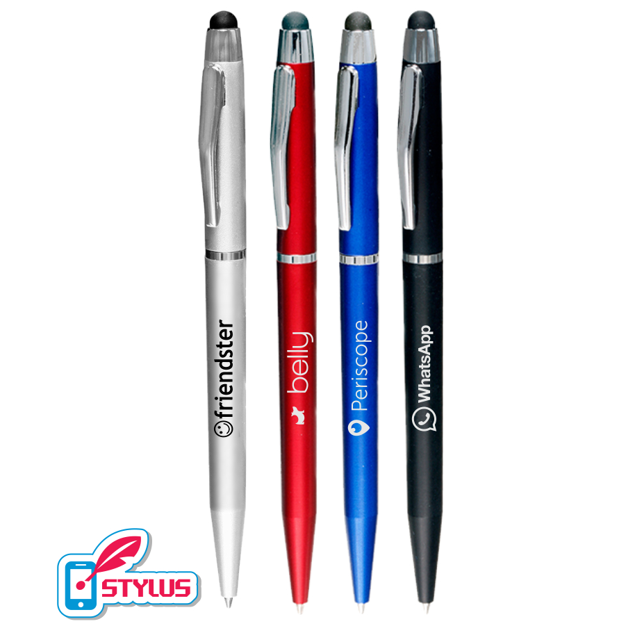 Union Printed, "Appealing" Slim Stylus Twister Pen, These Twist Action pens feature an elegant designed Colored Barrel with Silver Accents and ring also Features a Responsive Stylus Point on Tip for All Smartphone and Tablet Devices. this is the perfect Stylus pen to promote your business or to hand out by trade shows. Decorated in our Union Shop - Union Bug Available at No Charge!