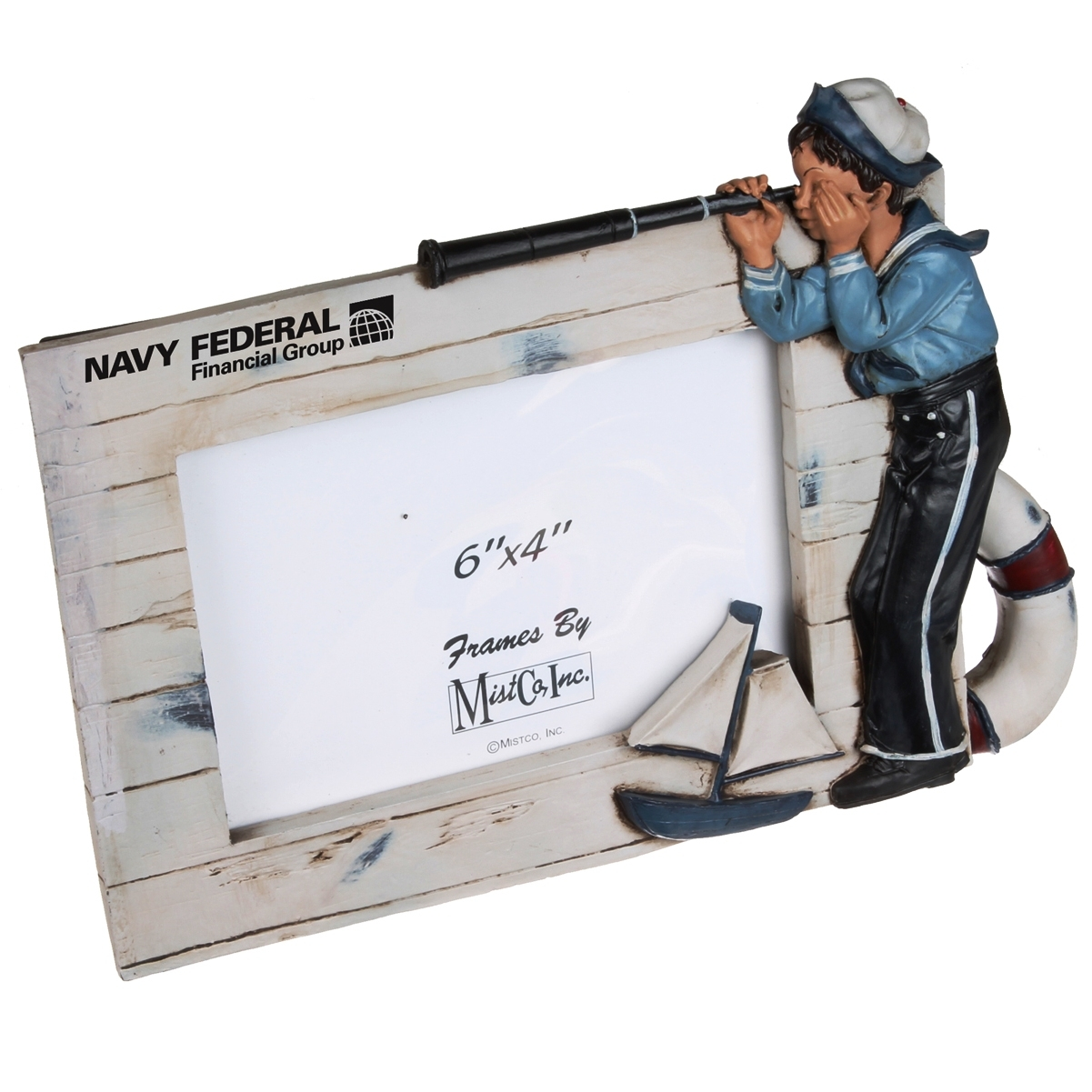Land ho! Made from poly resin, this sailor frame will fit any 6"x4" picture. The edge of the frame features some classic oceanic imagery including a young mariner looking out to sea through a spyglass, a sailboat and a life buoy. This frame can perfectly accommodate any picture taken out at sea, on boat or at the beach. Imprint your company name or log on the top left side of the frame. 9 1/8" W x 6 1/2" H