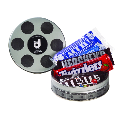 Reel in the business with movie film tins! These film reel tins are a great take home give away that everyone will enjoy! The Movie Pack includes M&M's, Hershey's milk chocolate bar, Twizzlers, and microwave popcorn. If temperature exceeds 70 degrees, shipping coolers may be required; call for price quote. 6.69" Diameter x 1.81" H