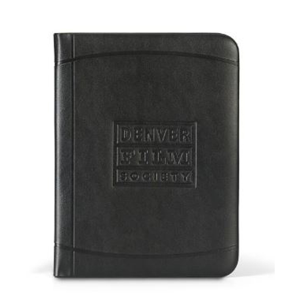 Made from simulated leather. This contemporary writing pad is the perfect gift for all business professionals. The paper pad can be placed to accommodate left or right hand users. The interior features multiple pockets to store business cards and other essentials, a pen loop (pen not included) and includes a 5"x8" paper pad. Complies with CPSIA, Prop 65. 6.75" L x 9" H x 0.5" W
