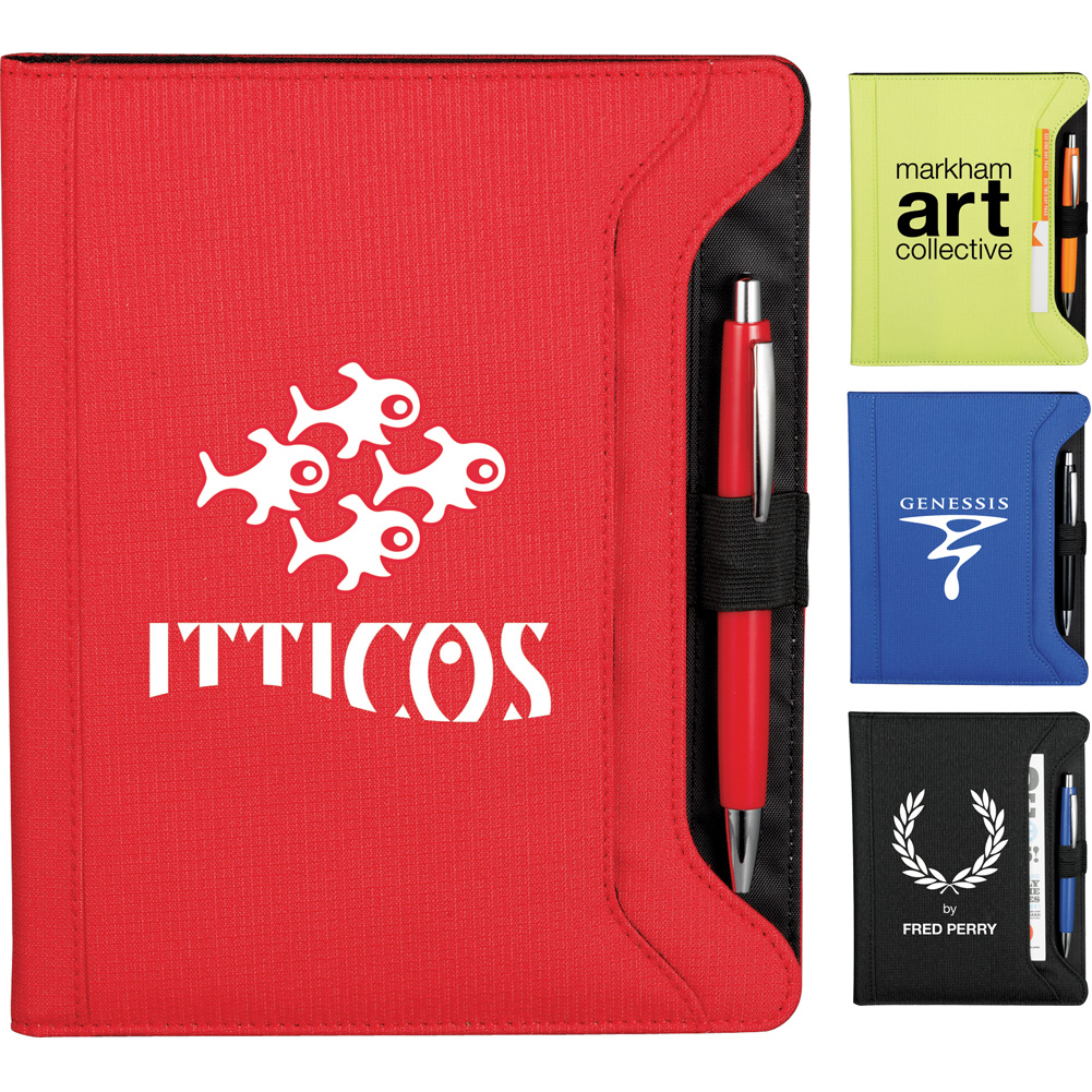 Ripstop nylon. Document pocket on front cover. Inside panel contains 7 card pockets and an interior document pocket. Includes refillable, 30 ruled page notepad and elastic pen loop. 8.5" H x 6.75" W