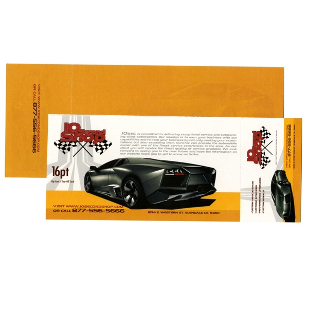 Postcard with tear-off perforation on 16 Point with UV in 4/4 full color on both sides. More convenient then ever, Tear-Off Cards are a perfect 2-in-1 promotion piece to get your name out and your customers to easily remember you. Tear-Off Cards have a perforated business card on the bottom, where your customers can easily tear-off and store. As well Tear-Off Cards offer a multitude of uses such as membership cards, coupons, etc. Printed with soy inks. 8.5" L x 3.5" W