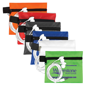 This Tech Kit provides the essential mobile and tech accessory you need for travel or on the go. Includes white headphone earphones and matching color zipper pouch. Complies with CPSIA. 5" W x 4 1/4" H