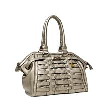 Do you like details that WOW? The Alexis won't disappoint! Features a woven front with gold stud details and working turn lock buckle, rolled carry handles and removable crossbody/shoulder strap, an exterior back wall zip pocket, and a top zip closure. Interior features patterned polyester lining, back-wall zip pocket and two slip pockets. 13" L x 5.25" W x 11.5" H