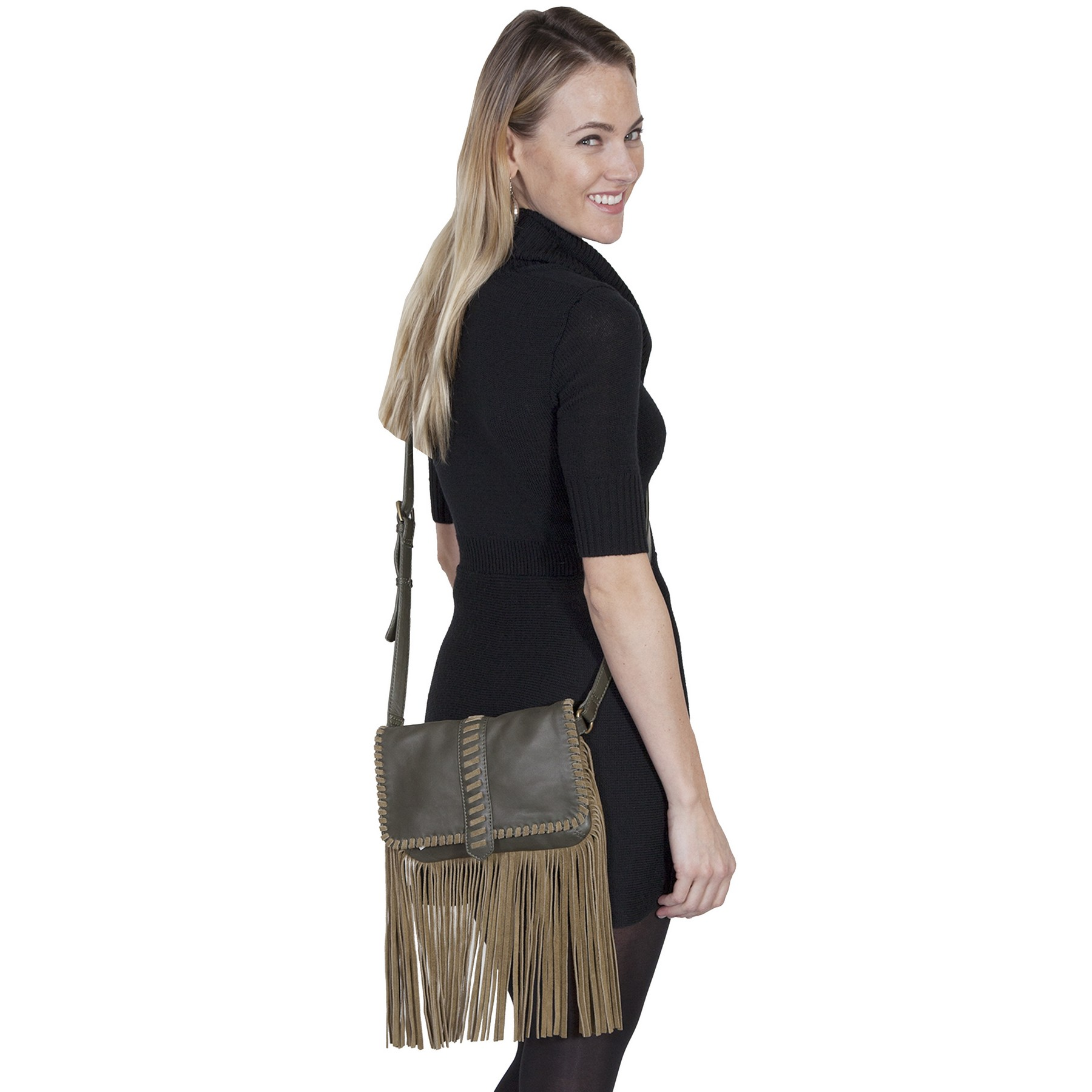 Leather Handbag With Suede Fringe And Trim. Size 9.25" X 6.5" X .5". 9.25" L x 6.5" H x 0.5" W