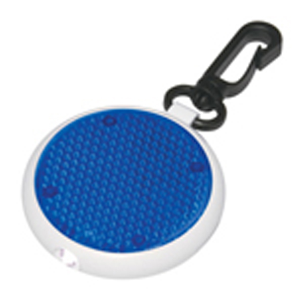 Clip-on reflector with flashing LED light. Two different light settings. Swivel clip for attachment. Push button to turn on/off. Button cell batteries included. 2" Diameter