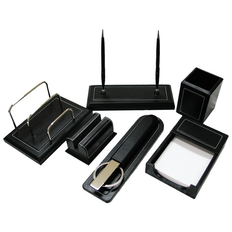 Includes: scissor & letter opener set, letter holder, double pen stand, pencil cup, 4x6 memo case, letter opener, and business card holder.