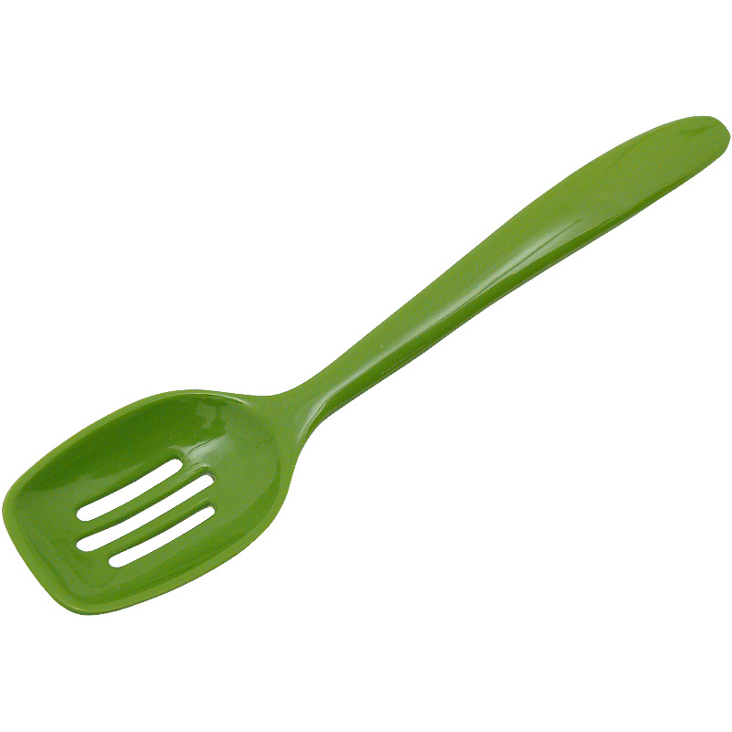 7 1/2 Lime Green Melamine Mini Slotted Spoon Heat resistant to 360F. Dishwasher safe. Ideal for use on non-stick cookware.