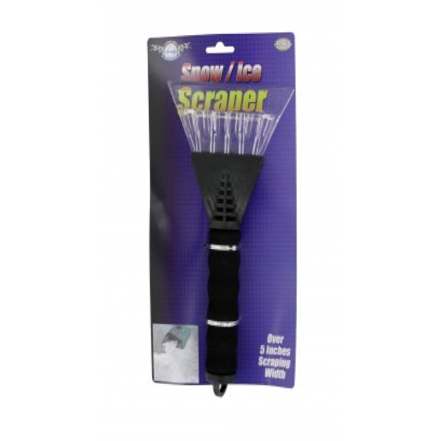 The perfect winter tool for automobiles, this convenient Snow & Ice Scraper features a wide plastic blade with an angled edge for easy removal of ice or snow and a grooved foam handle for a secure and comfortable grip. Handle has a hanging loop for convenient storage. 10 1/2" L x 5" W