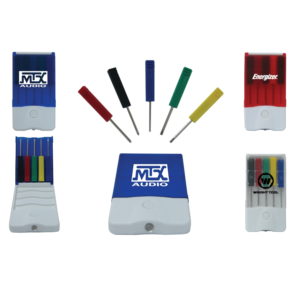 This five piece tool set would be ideal for promoting a variety of industrial businesses! Includes 5 different screwdriver heads (3 flat and 2 Phillips) enclosed within a colorful case with snap closure. This handy collection features a white LED light that's activated by the push of a button. Have your company name or logo printed on the case then use the finished products as gifts for retiring employees or new hires!. 3 3/4" L x 2" W