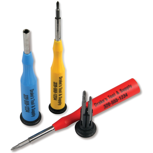 Handy mini screwdriver set sits on your workbench, counter or table and hold 8 mini screwdriver bits plus is a hex driver. Complies with Prop 65. 6 1/2" W x 5/8" Diameter