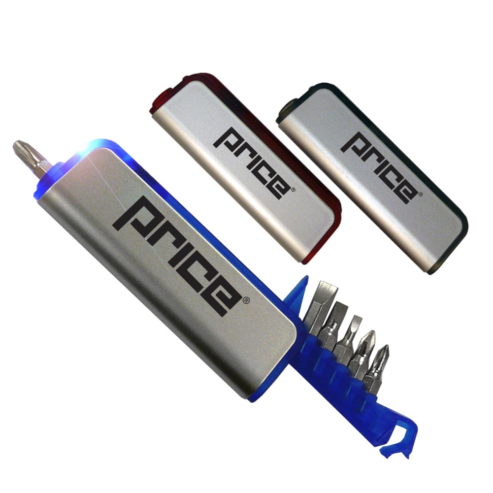 Mini tool kit features three slotted screwdrivers and two Phillips head screwdrivers. Screwdrivers are stored within the item and are interchangeable. Also includes flashlight. Color trim. 3 7/8" L x 1 1/4" W