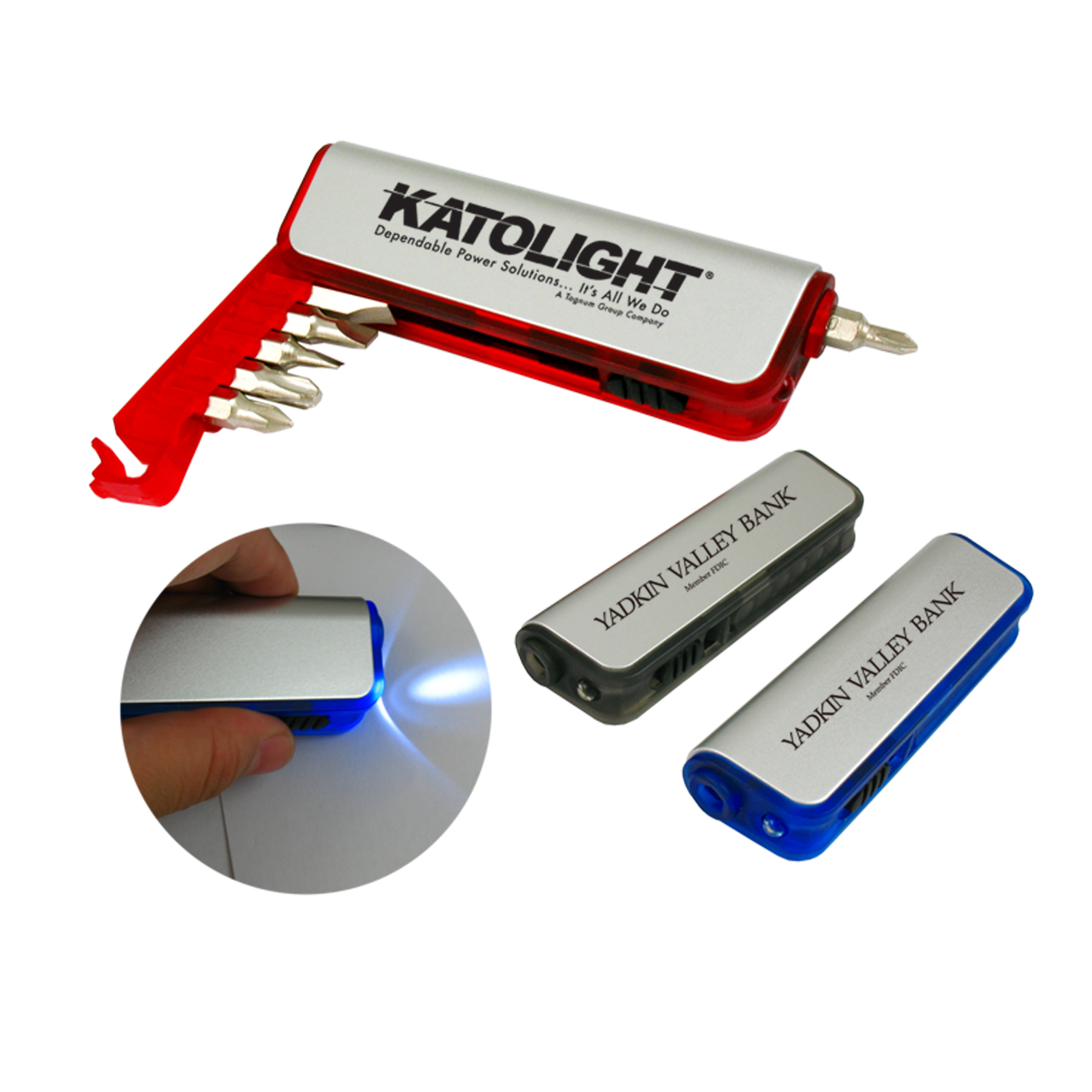 Mini tool kit with bright LED light, Pocket sized portability, Five interchanging bits, 1 AG13 cell batteries included. 4" W x 1 1/4" H