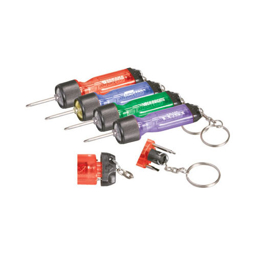 Our very great quality keychain. The Light Driver features a powerful mini flashlight with twist-action on and off control to illuminate your work area. The screwdriver handle conveniently stores two double-end precision bits: one Phillips and one flathead. Operates on one AAA battery (not included). Gift boxed. These keychain's are imported from overseas and shipping cost not included, please quote for in hand price.. 3 1/8" W x 7/8" D