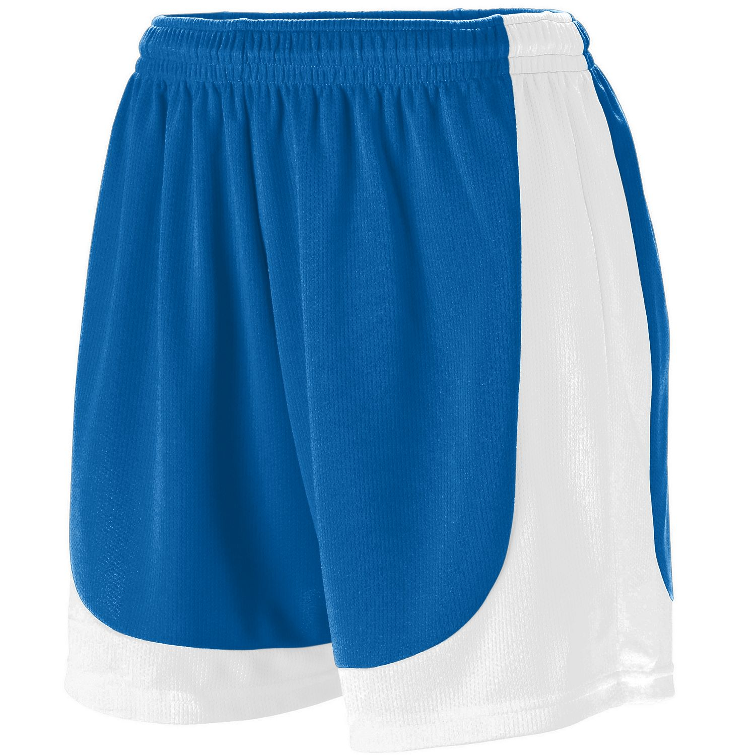 100% Polyester wicking mesh fabric. Wicks moisture away from the body. Heat sealed label. Covered elastic waistband with inside drawcord. White side panels and bottom with inseam graded. Double-needle hemmed bottom.