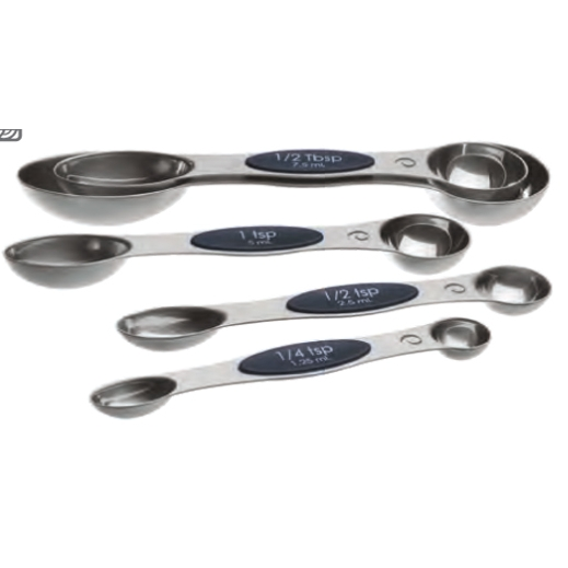 ABS and Magnets. 5 piece set includes standard and metric measurements. 1/4 Tsp., 1/2 Tsp., 1 Tsp., 1/2 Tbsp. and 1 Tbsp. Magnetic for convenient storage. Narrow end designed to fit most spice jars and round end is perfect for liquids. Flat base allows spoon to rest on counter top without spilling contents. Dishwasher safe. Patented item.
