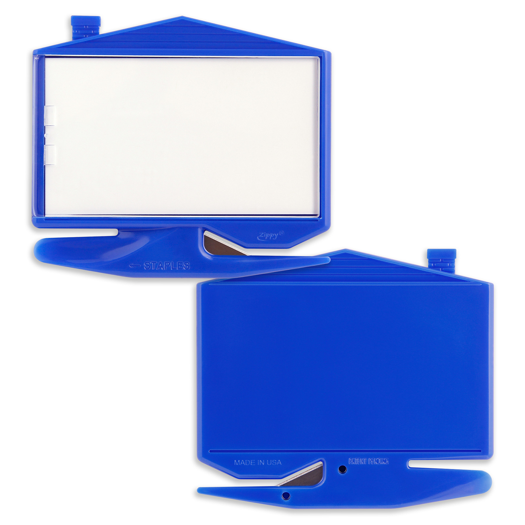 Insert a business card for instant personalization. Dual function letter opener/ staple remover. Clear item compatible with a 2-sided business card. Made in the USA. Stainless steel blade. Fits standard 3 1/2"x2" business card. 8 great colors to choose from. 3 3/8" H x 3 13/16" W